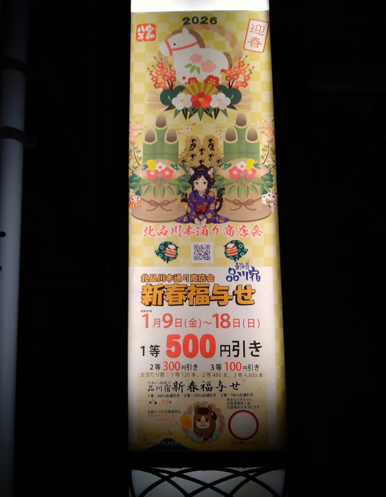 北品川本通り商店会 街路灯行灯 2025年12月29日 最終更新日時 : 2025年12月29日 kazu 年末も押し迫ってまいりました。街灯行灯に新しいお知らせが入りました。来年、年明け1月9日~18日 スクラッチカード福与せ売出しを開催いたします。こうご期待ください! FacebookXBlueskyCopy